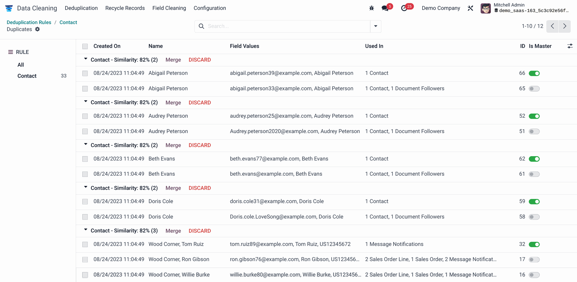 Odoo's deduplicate data app: Create data matching rules to detect duplicate records for your review. Merging a contact or product will combine its sale history.